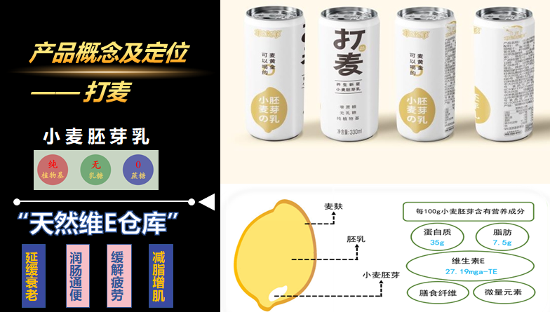 打麥?zhǔn)怯尚←溑哐考庸ざ傻闹参锘鞍罪嬈贰P←溑哐渴切←湹暮诵暮蜕?000斤小麥才可提取1斤胚芽,經(jīng)烘培后得到金黃色的小麥胚芽片。小麥胚芽雖然僅占麥粒重量的2%,但營(yíng)養(yǎng)卻占整個(gè)麥粒的97%。因此,小麥胚芽被譽(yù)為“人類天然的營(yíng)養(yǎng)寶庫(kù)”,含豐富的維他命E、B1及蛋白質(zhì),是高營(yíng)養(yǎng)的天然食品,具有延緩衰老、緩解疲勞、潤(rùn)腸通便、減脂增肌的功效。打麥同樣具有0蔗糖,純植物基,無(wú)乳糖,低膽固醇、高纖維的特點(diǎn)。作為植物蛋白飲料,打麥的主要消費(fèi)群體定位為動(dòng)物保護(hù)主義者、素食主義者和乳糖不耐受人群,對(duì)于加班族、健身和塑身人群,老年人也非常適合。